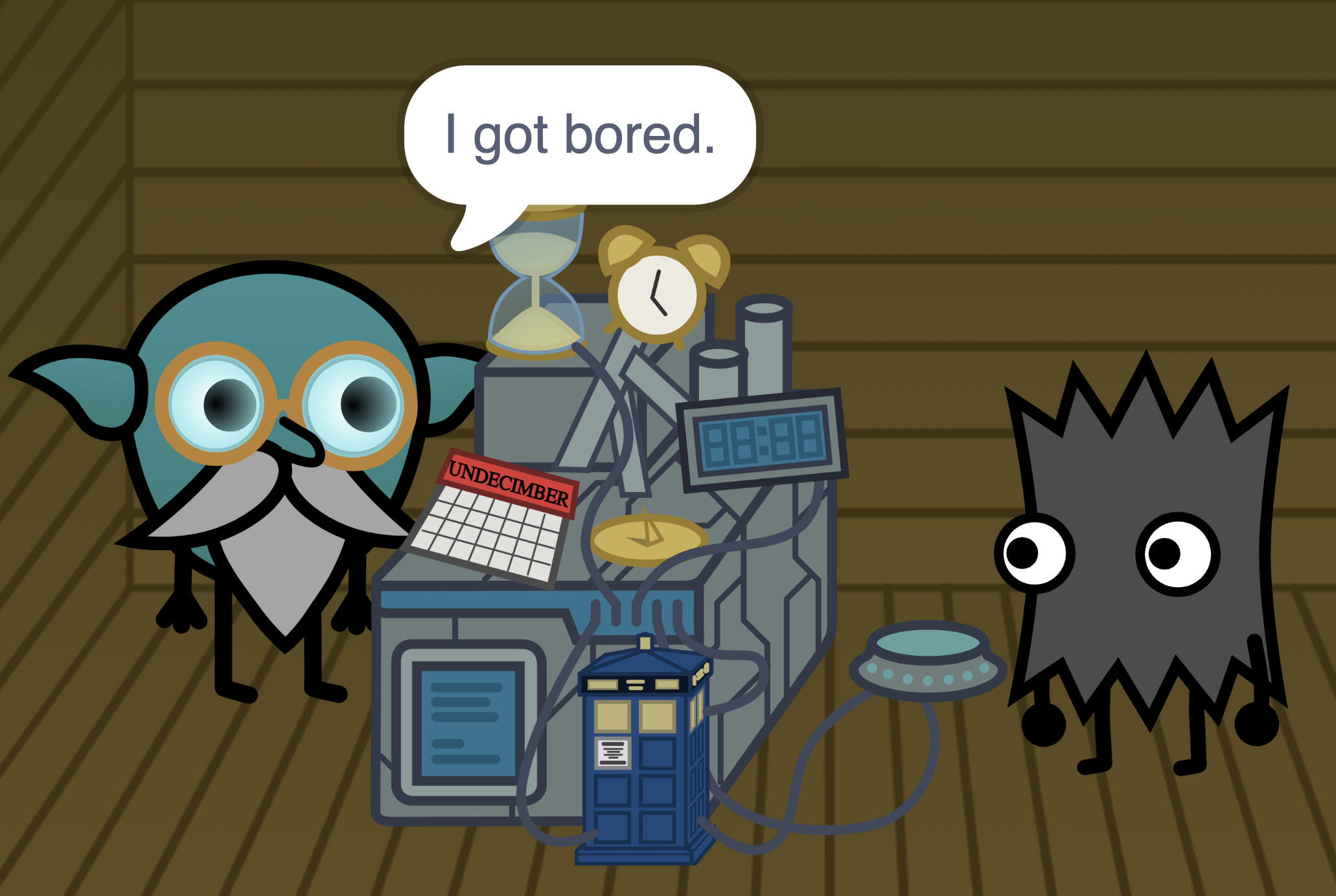 The police box connected to the machine in the shed is the TARDIS from Doctor Who by BBC
